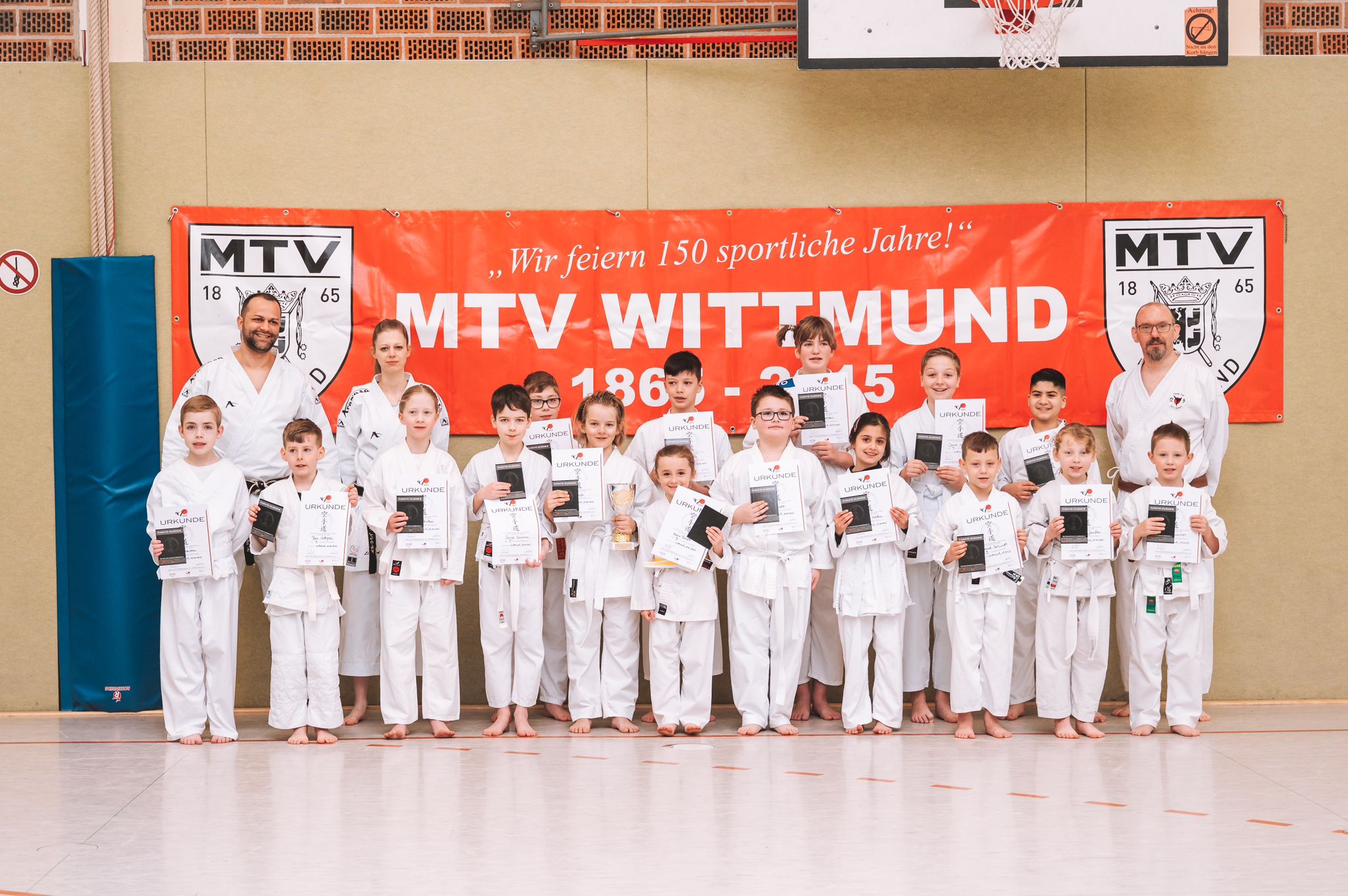 Insgesamt stellten sich 31 Prüflinge der Gürtelprüfung. Jaron Neuhaus, Leigh Schramm, Janna Motzkus und Felix Blech konnten aufgrund Ihrer sehr guten Leistungen eine Doppelprüfung ablegen und dürfen jetzt den 8.Kyu (Gelbgurt) tragen.