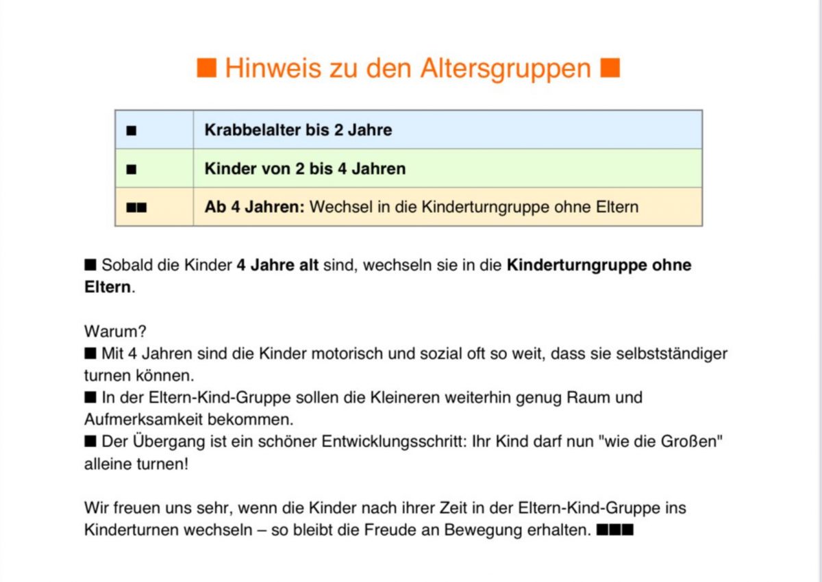 15. September 2025In der letzten Zeit hat es mehrfach Missverständnisse bezüglich des Kinderturnens gegeben. Deshalb hier noch einmal die Regeln, welches Kind in welche Gruppe kommen darf: