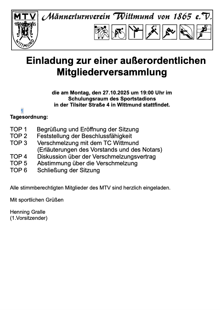 7. Oktober 2025Der MTV Wittmund und der TC Wittmund wollen wieder zu einem Verein werden und verschmelzen. Deshalb findet eine außerordentliche Mitgliederversammlung statt, für die ihr hier die Einladung findet: