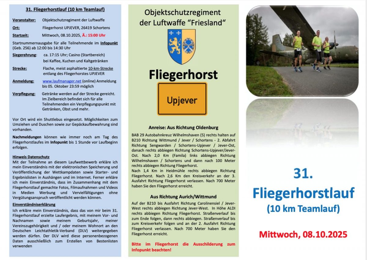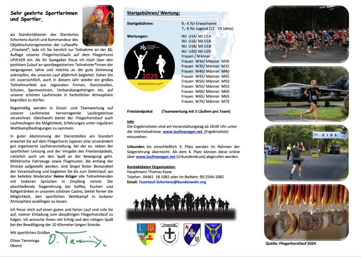 die Bundeswehr in Upjever lädt zum 31. Fliegerhorstlauf (Teamlauf) auf den wunderschönen Fliegerhorst Upjever. Der Startschuss zu unserer traditionellen Veranstaltung fällt am 08. Oktober 2025 um 15:00 Uhr. Anmeldungen können unter http://www.laufmanager.net online erfolgen. Auch für kurzentschlossene gibt es am Tag der Veranstaltung bis 60 min vor dem Start die Möglichkeit der Nachmeldung. Neben der Auszeichnung der schnellsten Läufer*innen wird auf unserer 10 Km Lauftrecke auch wie immer das schnellste Team (bestehend aus mind. 5 Teilnehmenden) ermittelt und läuft um den Frieslandpokal. Alle weiteren Informationen zum Lauf, können dem beigefügtem Flyer entnommen werden. Scheuen Sie nicht uns bei offenen Fragen zu kontaktieren.