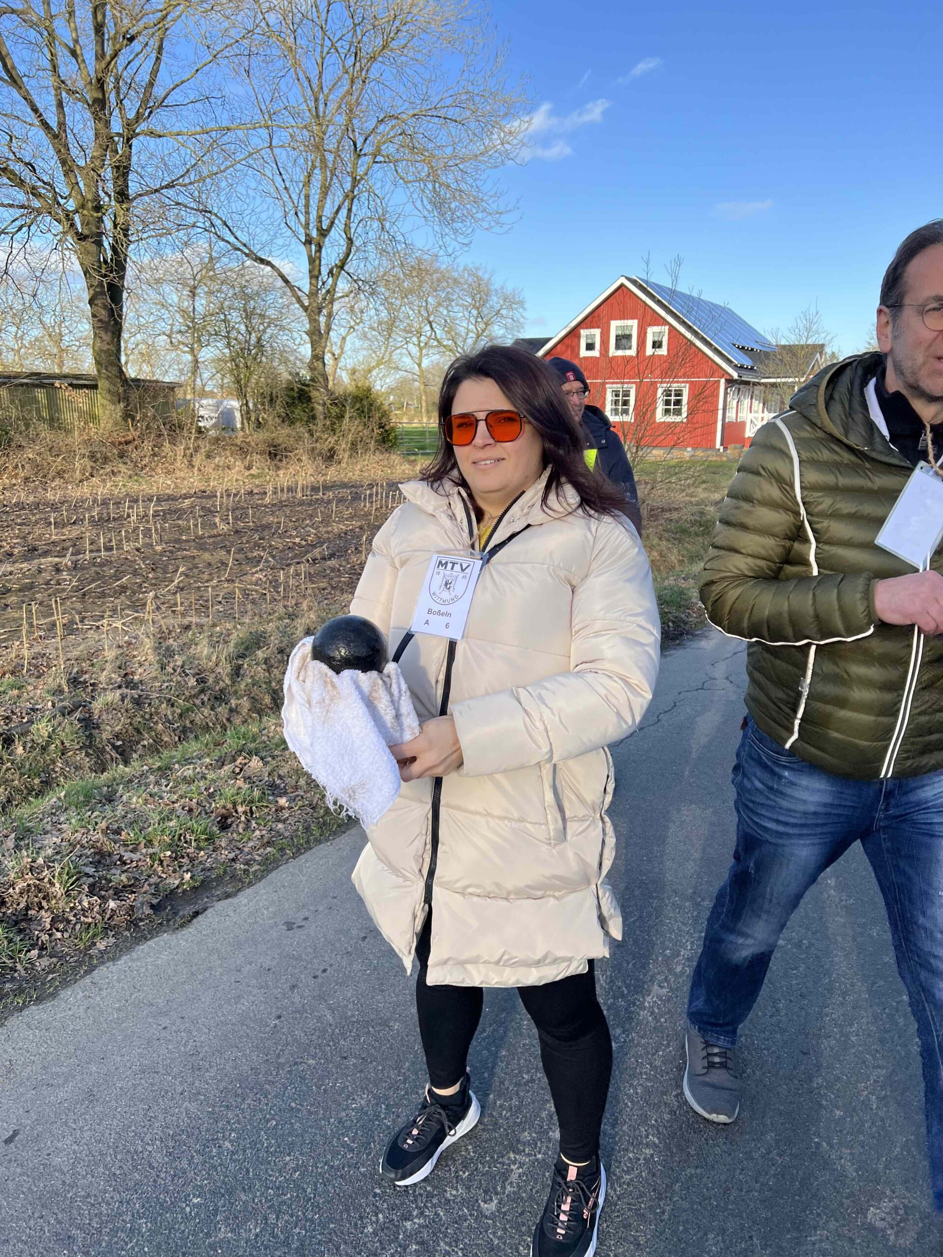 Nachdem es während der ganzen Woche fast ununterbrochen geregnet hatte, war den Aktiven des MTV Wittmund der Wettergott gnädig. Bei strahlendem Sonnenschein trafen sich Übungsleiter und Mitglieder des erweiterten Vorstandes zu einer zünftigen Boßeltour auf dem Alten Postweg in Updorf. Nachdem die Teilnehmer in zwei Werfergruppen aufgeteilt worden waren ging es auf die Strecke. Hier versuchte jeder, möglichst große Weiten zu erzielen, was teilweise auch recht gut gelang. Auf dem Hinweg erwies sich Gruppe B als die eindeutig bessere Mannschaft. Nach einer Rast in Willen ging es dann auf die Rücktour, wo sich zeigte, dass sich Gruppe A bisher nur leistungsmäßig zurückgehalten hatte und jetzt mehrmals große Weiten erwarf. So konnte man als Endergebnis von einem gerechten Unentschieden ausgehen und sich dann zur Gastwirtschaft „Bei Bodo“ aufmachen, wo die Veranstaltung mit einem leckeren Grünkohlessen und einem anschließenden gemütlichen Zusammensein ausklang. Insgesamt also ein sehr schönes Highlight, welches das gute Klima unter den „Machern“ im Verein bestätigt und weiter gefördert hat.