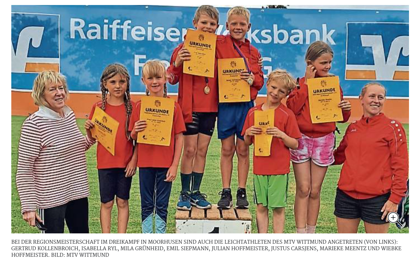 Bei diesem Mehrkampf werden die Tagesleistungen im 50-Meter-Lauf, Weitsprung und Ballwurf Punkten zugeordnet und diese dann addiert. Viele Kinder verbesserten ihre Bestmarken teils deutlich. Die kleine Mannschaft des MTV Wittmund war bei den Jungen sehr erfolgreich und stellte mit Emil Siepmann und Julian Hoffmeister die Sieger bei den acht- und neunjährigen Mehrkämpfern. Julian Hoffmeister lief in der Altersklasse M 8 die 50-Meter in 8,5 Sekunden, warf 23 Meter und sprang 2,88 Meter weit. Das reichte zu 709 Punkten.
