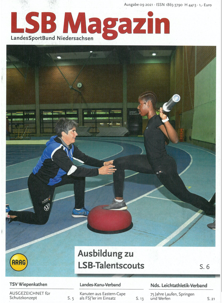 14. April 2022Der Name Fortuna Nkengue ist allen Leichtathletikfans in Wittmund und darüber hinaus bestens bekannt. Nach dem Gewinn mehrerer Meisterschaften (u.a. Landesmeisterin im Kugelstoßen und Vizemeisterin im Speerwurf – wir berichteten darüber) hat es die Ausnahmeathletin aus den Reihen des MTV-Wittmund jetzt auf die Titelseite des LSB Magazins des Landessportbundes Niedersachsen geschafft. Das von Debbie Jane Kinsey aufgenommene Titelfoto zeigt NLV-Landestrainerin Mehrkampf Beatrice Mau-Repnak mit Fortuna Ornella Nkengue bei einer Trainingseinheit im Sportleistungszentrum Hannover:
