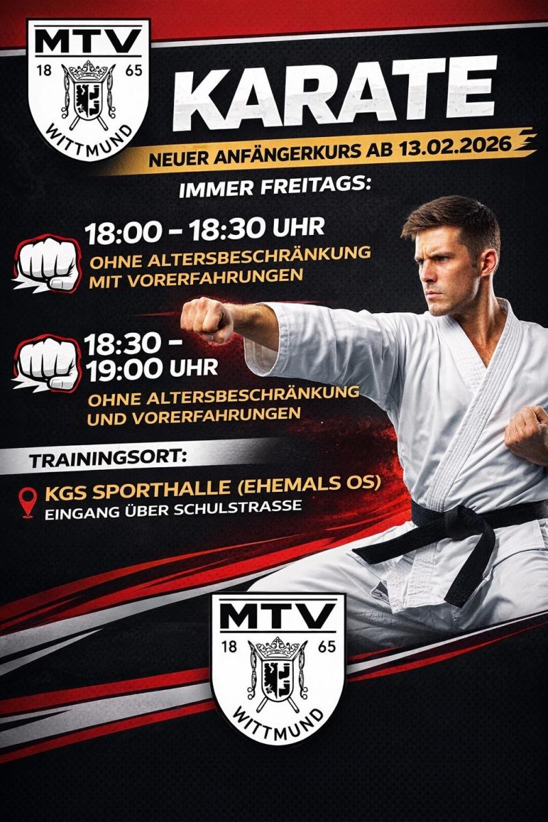 Hallensperrung7. Februar 2026 Neuer Karate-Anfängerkurs beginnt 12. Februar 2026 Ähnliche Beiträgedefault29. Januar 2026Die neue Tennisabteilung im MTV Wittmund stellt sich vorMehr lesen15. September 2025Wittmunder Jan Schüpp Bürgerlauf – die ErstplatziertenMehr lesen2. Juli 2025Hallen- uns Sportstättenschließungen während der SommerferienMehr lesen