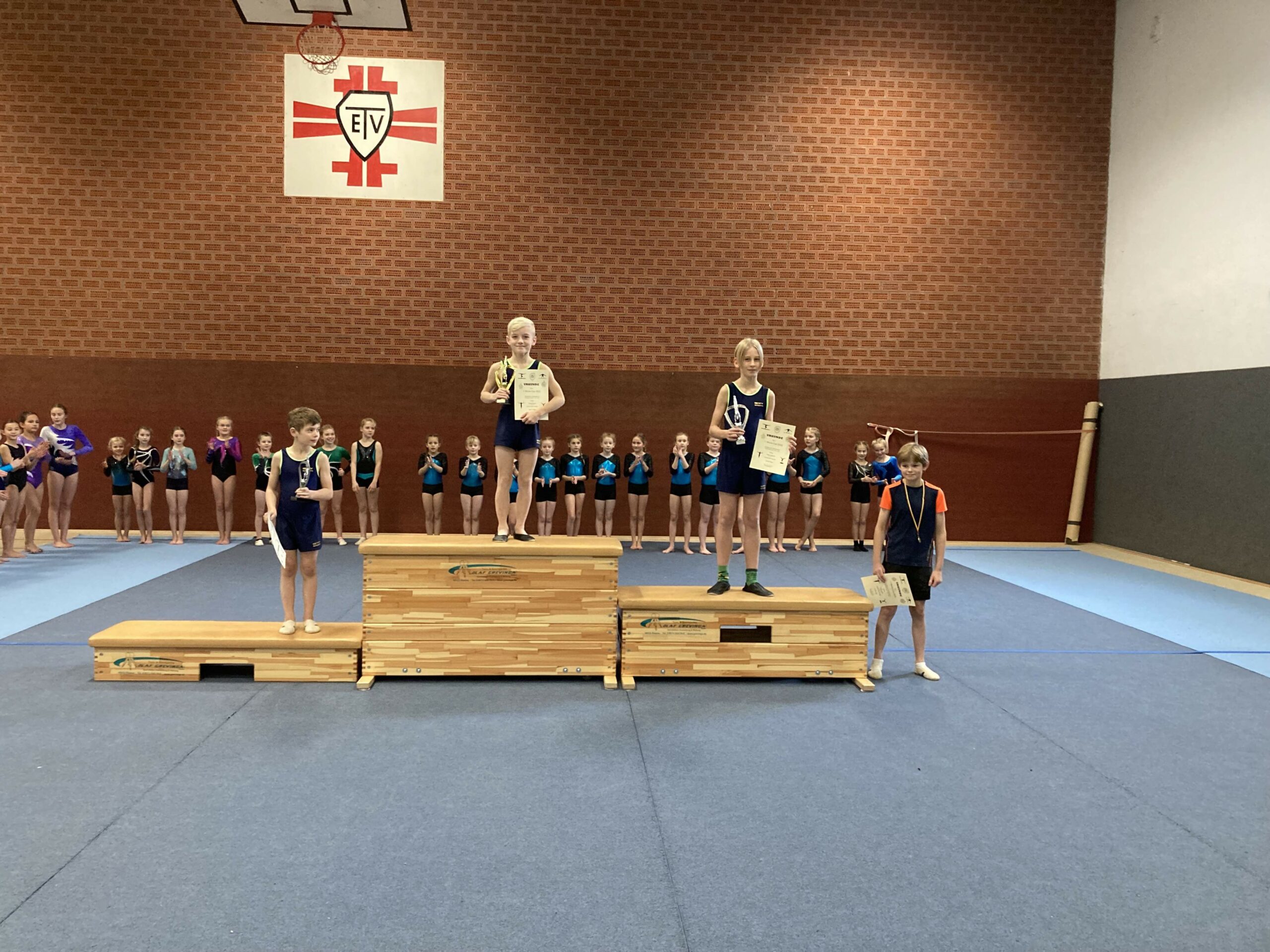 Die Jungen (hier gab es nur eine Altersklasse) mussten Ihren Wettkampf an vier der möglichen sechs Geräte (Boden, Seitpferd, Ringe, Sprung, Barren, Reck) absolvieren. Die Podestplätze gingen dabei allesamt an den Nachwuchs aus Wittmund: Oskar Münch siegte vor Jelde Kaffanke und Okke von Heimendahl. Alle drei fuhren nach Ihrem Wettkampf stolz nach Hause und freuen sich auf die nächsten Trainingsstunden.