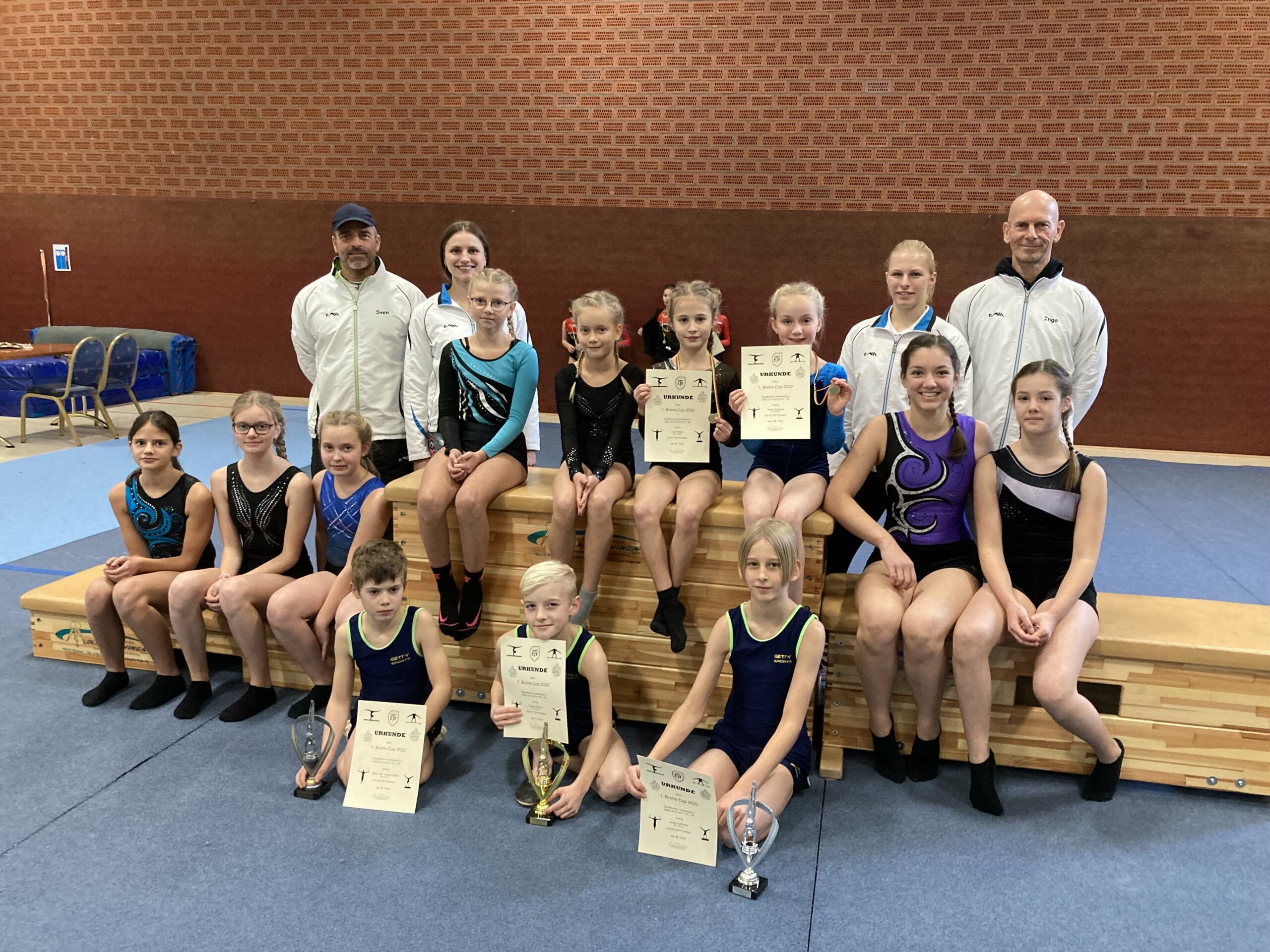 Am vergangenen Samstag wurde, organisiert vom Emder Turnverein, erstmals für weibliche und männliche Nachwuchsturner in Emden der 1. Brons-Cup ausgetragen. Die Turnvereine der Region (u.a. Emder TV, SC Wildeshausen, TuS Detern, TV Papenburg, TuS Glarum, TuSG Ritterhude) meldeten hierfür 7 Jungen und 105 Mädchen in den Altersklassen 5-16 Jahre als TeilnehmerInnen. Angetreten sind letztlich (viele kurzfristige krankheitsbedingte Ausfälle) 82 TurnerInnen. Insgesamt wurden 9 Wettkämpfe in den verschiedenen Altersklassen ausgetragen und entsprechend Pokale vergeben für die jeweils drei Erstplatzierten. Die Wittmunder TurnerInnen sind mit 12 Teilnehmern angetreten und erzielten in den verschiedenen Wettkämpfen sehr gute Platzierungen. Die Mädchen mussten Ihren Wettkampf an drei der vier möglichen Geräte (Balken, Sprung, Boden, Stufenbarren) absolvieren. Dabei erzielte Mila Stüwe einen sehr starken 1. Platz. Tomke Egberts schaffte es mit dem 2. Platz ebenfalls aufs Podest. Lilly Thölen hat das Podest mit 4 zehnteln Unterschied zum 3. Platz leider knapp verpasst. Jessie Decker, Jenna Stüwe, Leana Maz, Stella Berk, Deike Egberts und Hielke Egberts haben ebenfalls einen herausragenden Wettkampf geturnt und sich im guten Mittelfeld platziert.