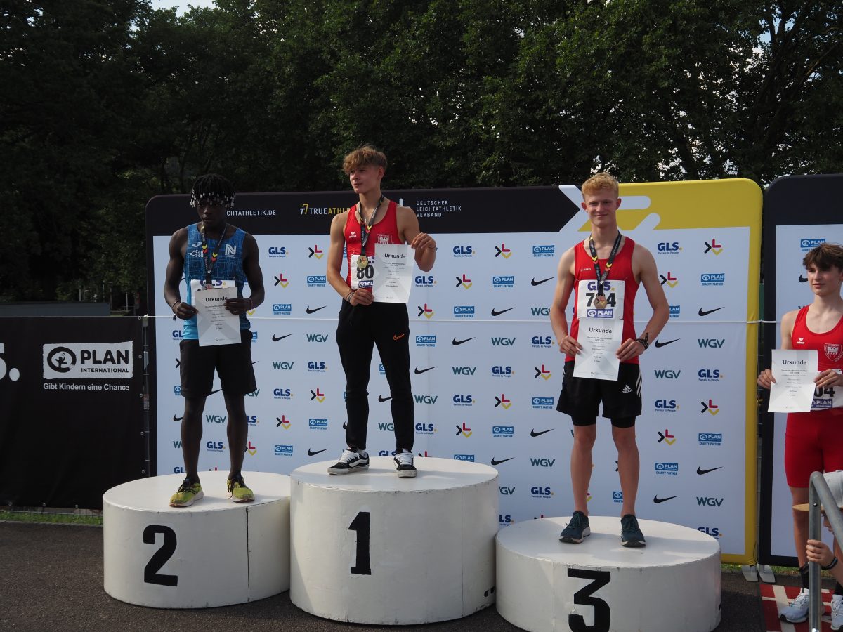 2. September 2024WITTMUND/KOBLENZ. (jos) Erik Siepmann ist schnell. Die Leichtathleten des MTV Wittmund wissen das schon länger, doch jetzt weiß es auch die gesamte Konkurrenz. Bei der Deutschen Meisterschaft in Koblenz sicherte sich der U 16-Sprinter des MTV die Bronzemedaille über 300 Meter. Nach 35,99 Sekunden überquerte er die Ziellinie und musste nur Lars Fischer (Eintracht Duisburg/38,85 Sek.) und Cedric Riecker (SU Neckarsulm/35,91 Sek.) den Vortritt lassen.