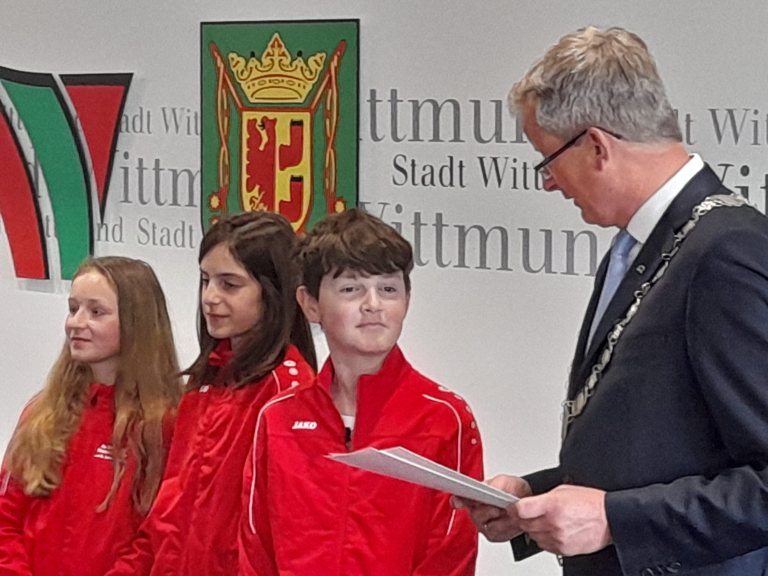 Von links: Lanah Hoffmeister, Jana Jancheski, Maximilian Bolinius mit dem Bürgermeister