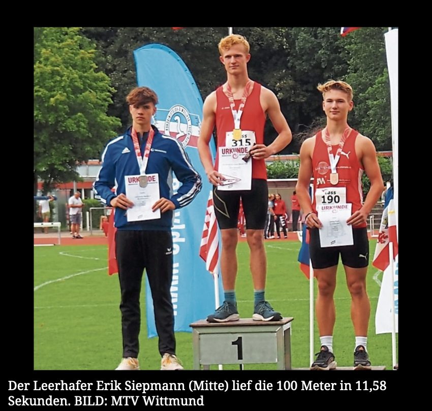 WITTMUND. (red) Wenige Wochen vor den Deutschen Meisterschaften in Koblenz hat Erik Siepmann vom MTV Wittmund bei den Norddeutschen Meisterschaften in Lübeck zwei große Erfolge gefeiert. Der 15-jährige Leichtathlet aus Leerhafe gewann das 100 Meter Rennen am Samstag im Foto-Finish gegen Jack Gordon Blackburn vom SC Neubrandenburg. Einen Tag später wurde er mit neuer persönlicher Bestleistung Vizemeister über die 300-Meter-Distanz.