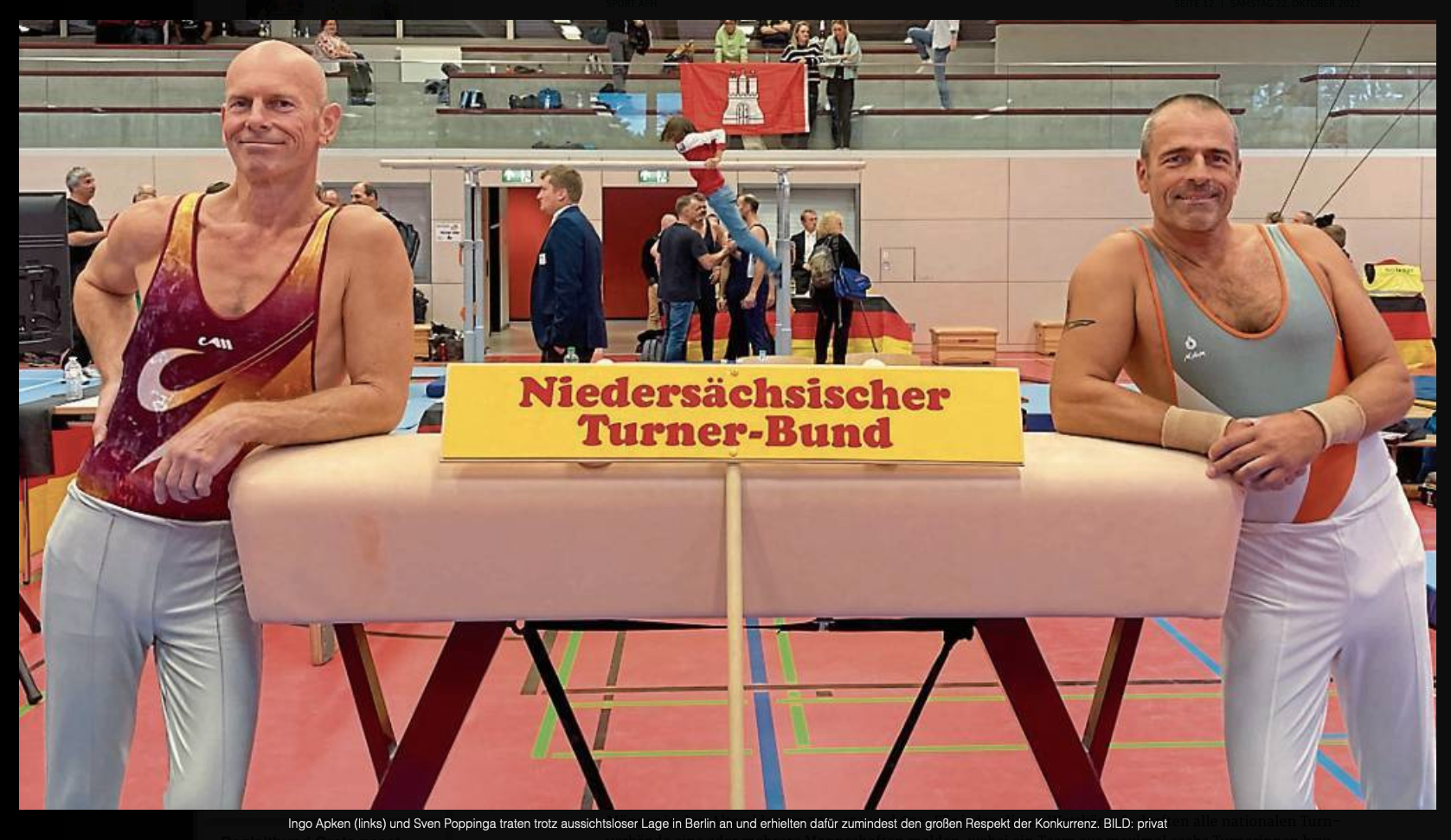 WITTMUND/STRAUSBERG. (ah) Wittmund gegen den Rest der Nation – so in etwa muss wohl das Motto von Ingo Apken und Sven Poppinga beim Deutschland-Pokal der Senioren in Strausberg bei Berlin gelautet haben. Die beiden Gerätturner des MTV Wittmund vertraten hier jetzt den Niedersächsischen Turnerbund (NTB). Eigentlich als Team, aber der dritte Turner im Bunde, ein Sportler aus Melle musste kurzfristig aus persönlichen Gründen passen. Die ohnehin mit drei Turnern minimal besetzten Mannschaft fehlte nun der wichtige dritte Turner. Somit stand schon vor dem Wettkampf fest, dass nur der letzte Platz zu erreichen war. „Jetzt erst recht“, werden sich die beiden verbliebenen Athleten gesagt haben Am Ende zählt natürlich auch der olympische Gedanke: Dabei sein ist alles.